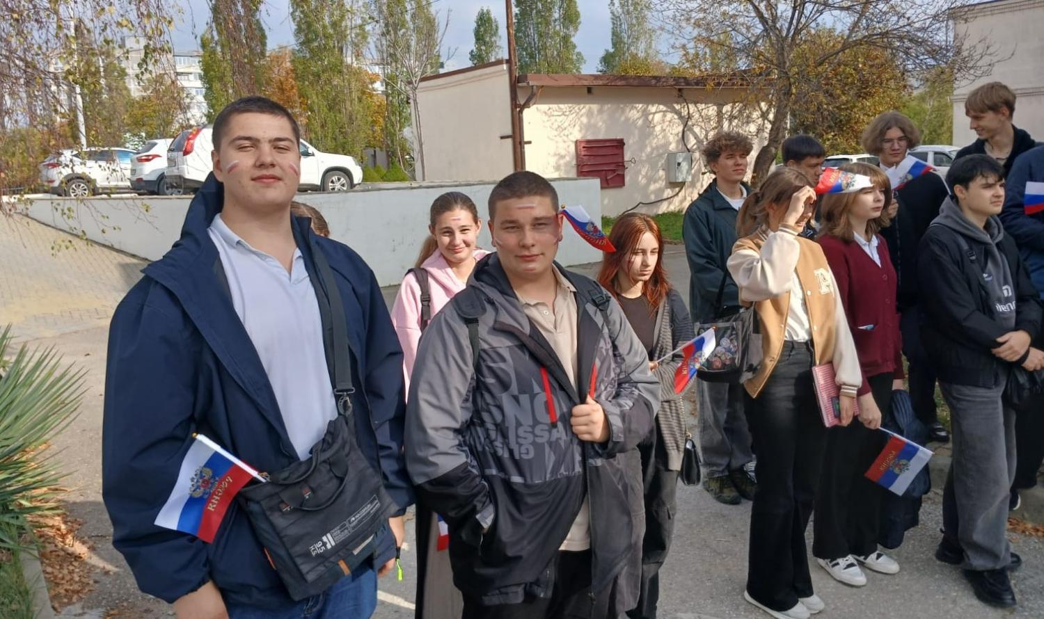 На большой перемене нарядные, в гриме, с символикой и флагами нашей Родины все собрались у входа в университет. Мы погрузились в историю праздника, услышали от нашего преподавателя, кандидата исторических наук Чегодаева Игоря Владимировича о том, как формировалась наша страна. Все получили заряд позитива и вдохновения.
